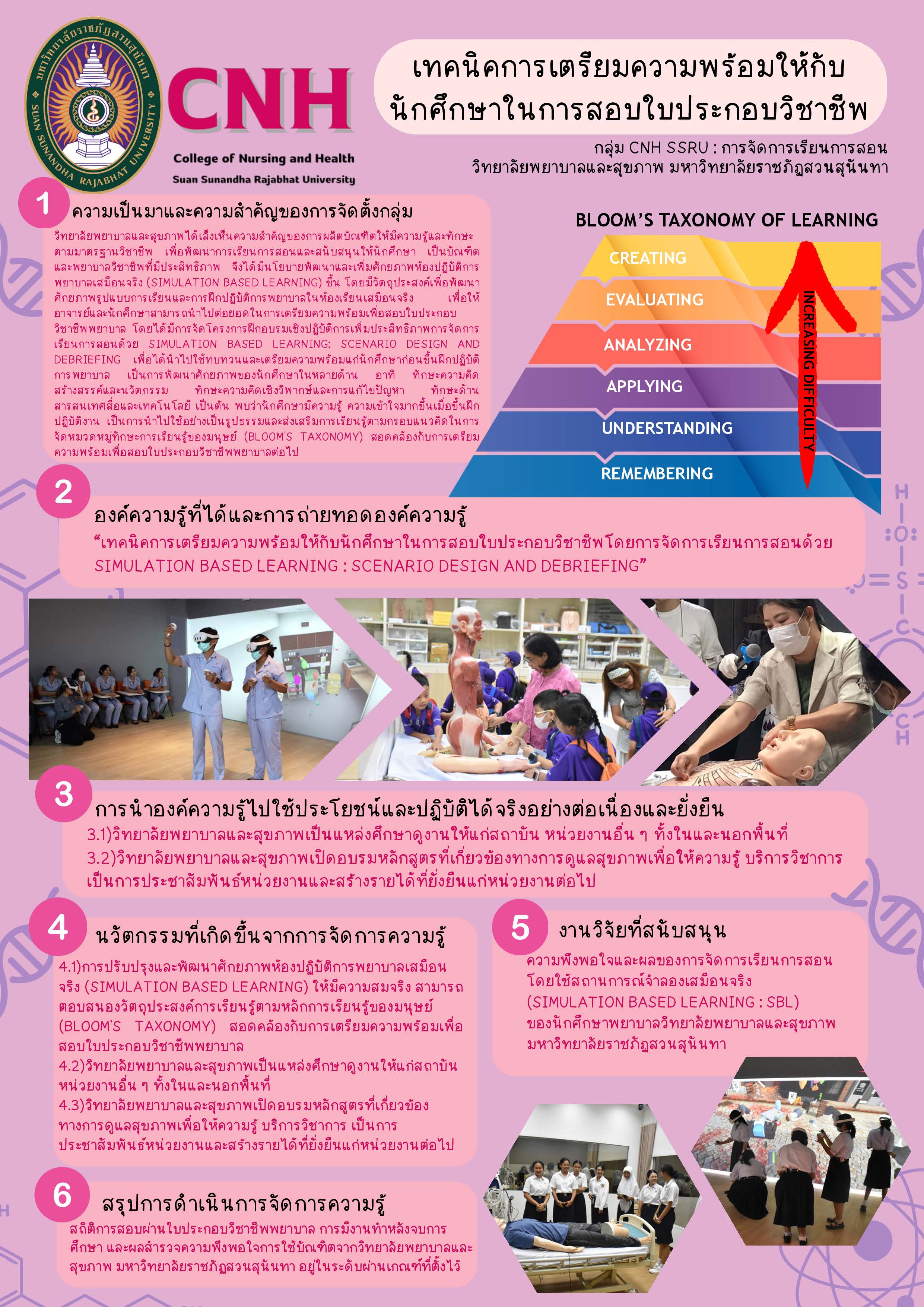 วิทยาลัยพยาบาลและสุขภาพได้เล็งเห็นความสำคัญของการผลิตบัณฑิตให้มีความรู้และทักษะตามมาตรฐานวิชาชีพ เพื่อพัฒนาการเรียนการสอนและสนับสนุนให้นักศึกษา เป็นบัณฑิตและพยาบาลวิชาชีพที่มีประสิทธิภาพ จึงได้มีนโยบายพัฒนาและเพิ่มศักยภาพห้องปฏิบัติการพยาบาลเสมือนจริง (Simulation based learning) ขึ้น โดยมีวัตถุประสงค์เพื่อพัฒนาศักยภาพรูปแบบการเรียนและการฝึกปฏิบัติการพยาบาลในห้องเรียนเสมือนจริง เพื่อให้อาจารย์และนักศึกษาสามารถนำไปต่อยอดในการเตรียมความพร้อมเพื่อสอบใบประกอบวิชาชีพพยาบาล โดยได้มีการจัดโครงการฝึกอบรมเชิงปฏิบัติการเพิ่มประสิทธิภาพการจัดการเรียนการสอนด้วย Simulation Based Learning: Scenario Design and Debriefing เพื่อได้นำไปใช้ทบทวนและเตรียมความพร้อมแก่นักศึกษาก่อนขึ้นฝึกปฏิบัติการพยาบาล เป็นการพัฒนาศักยภาพของนักศึกษาในหลายด้าน อาทิ ทักษะความคิดสร้างสรรค์และนวัตกรรม ทักษะความคิดเชิงวิพากษ์และการแก้ไขปัญหา ทักษะด้านสารสนเทศสื่อและเทคโนโลยี เป็นต้น พบว่านักศึกษามีความรู้ ความเข้าใจมากขึ้นเมื่อขึ้นฝึกปฏิบัติงาน เป็นการนำไปใช้อย่างเป็นรูปธรรมและส่งเสริมการเรียนรู้ตามกรอบแนวคิดในการจัดหมวดหมู่ทักษะการเรียนรู้ของมนุษย์ (Bloom's Taxonomy) ได้แก่ การจำ (Remembering), การเข้าใจ (Understanding), การประยุกต์ (Applying), การวิเคราะห์ (Analyzing), การประเมิน (Evaluating) และ การสร้างสรรค์ (Creating) สอดคล้องกับการเตรียมความพร้อมเพื่อสอบใบประกอบวิชาชีพพยาบาลต่อไป