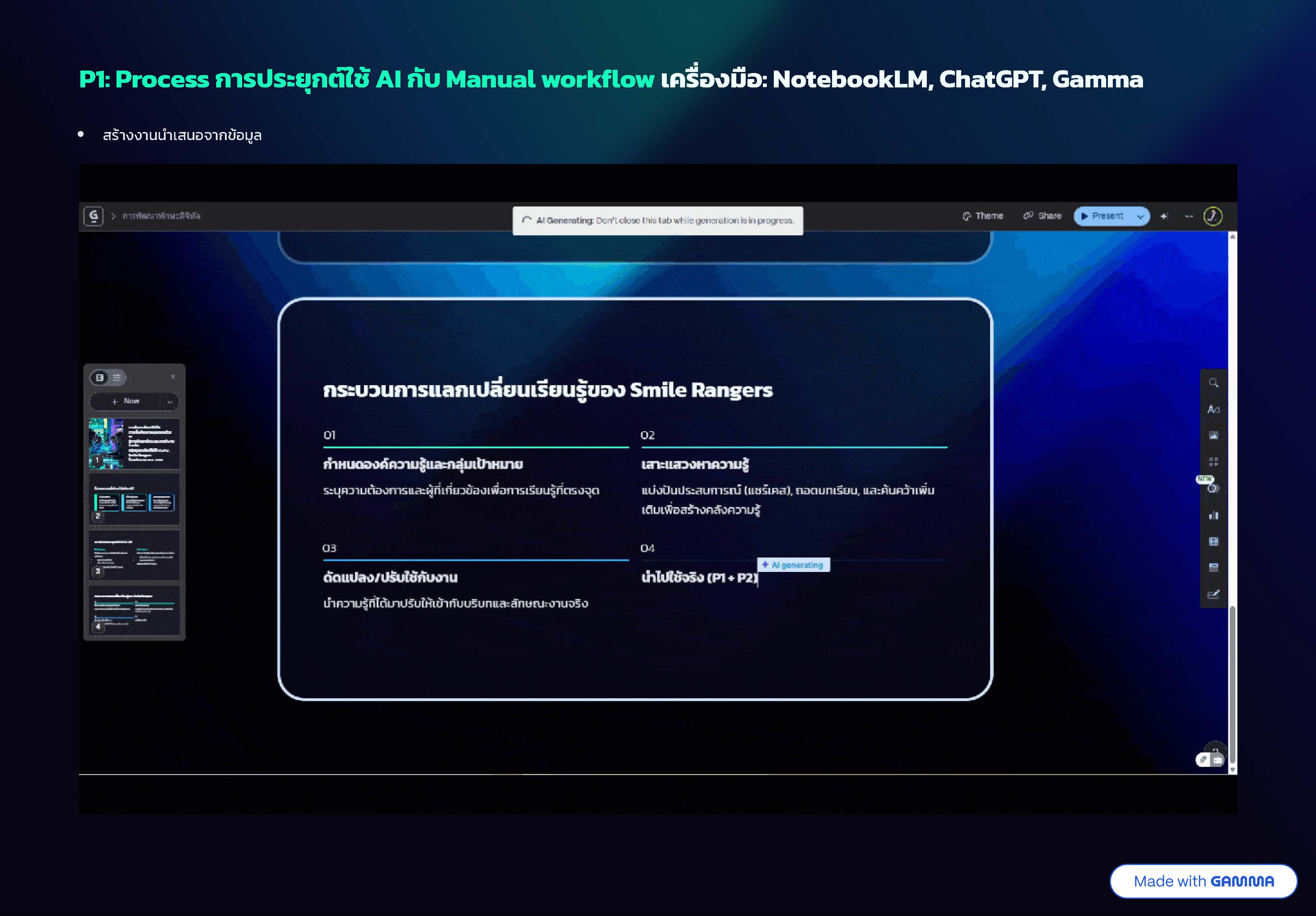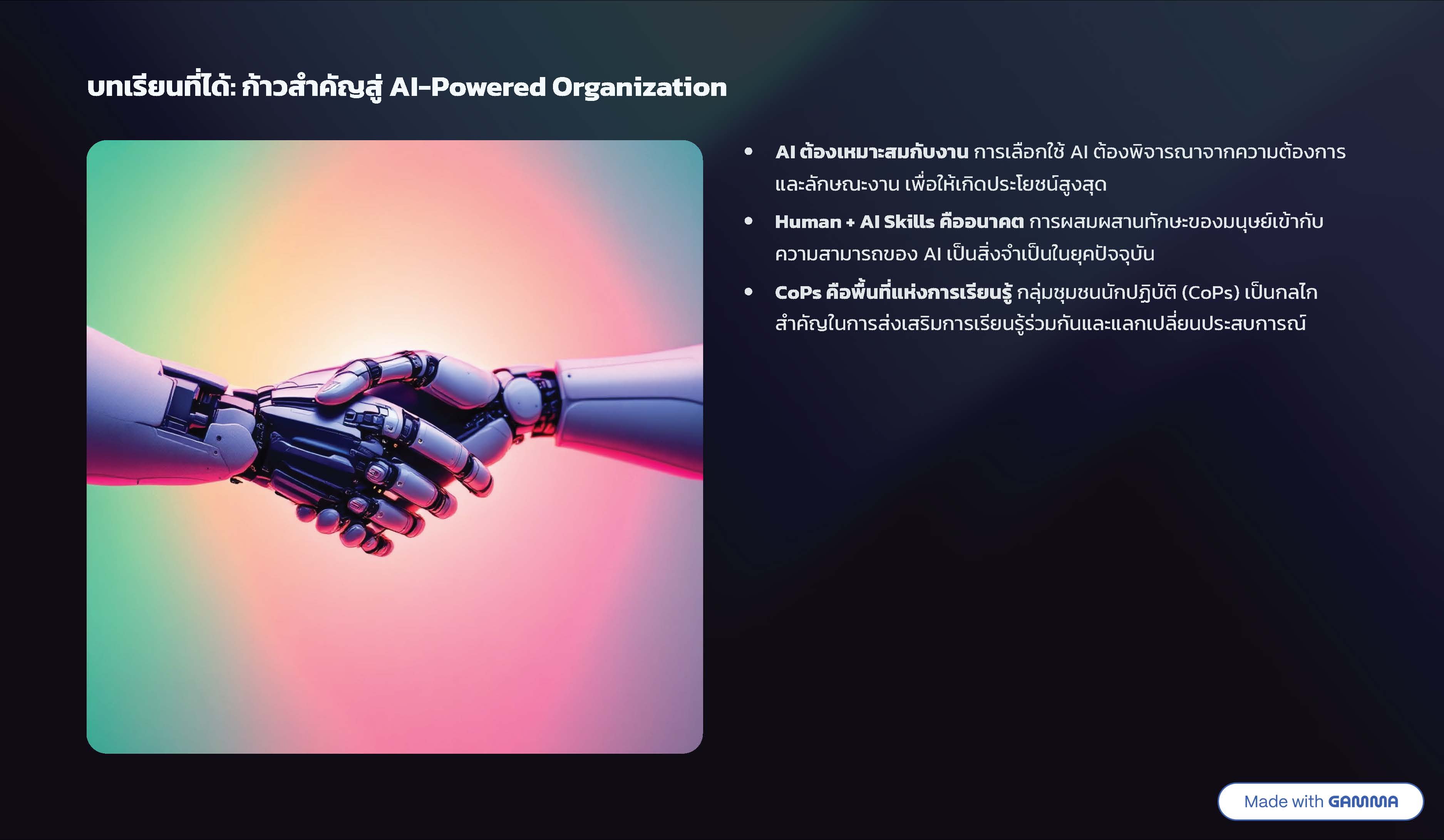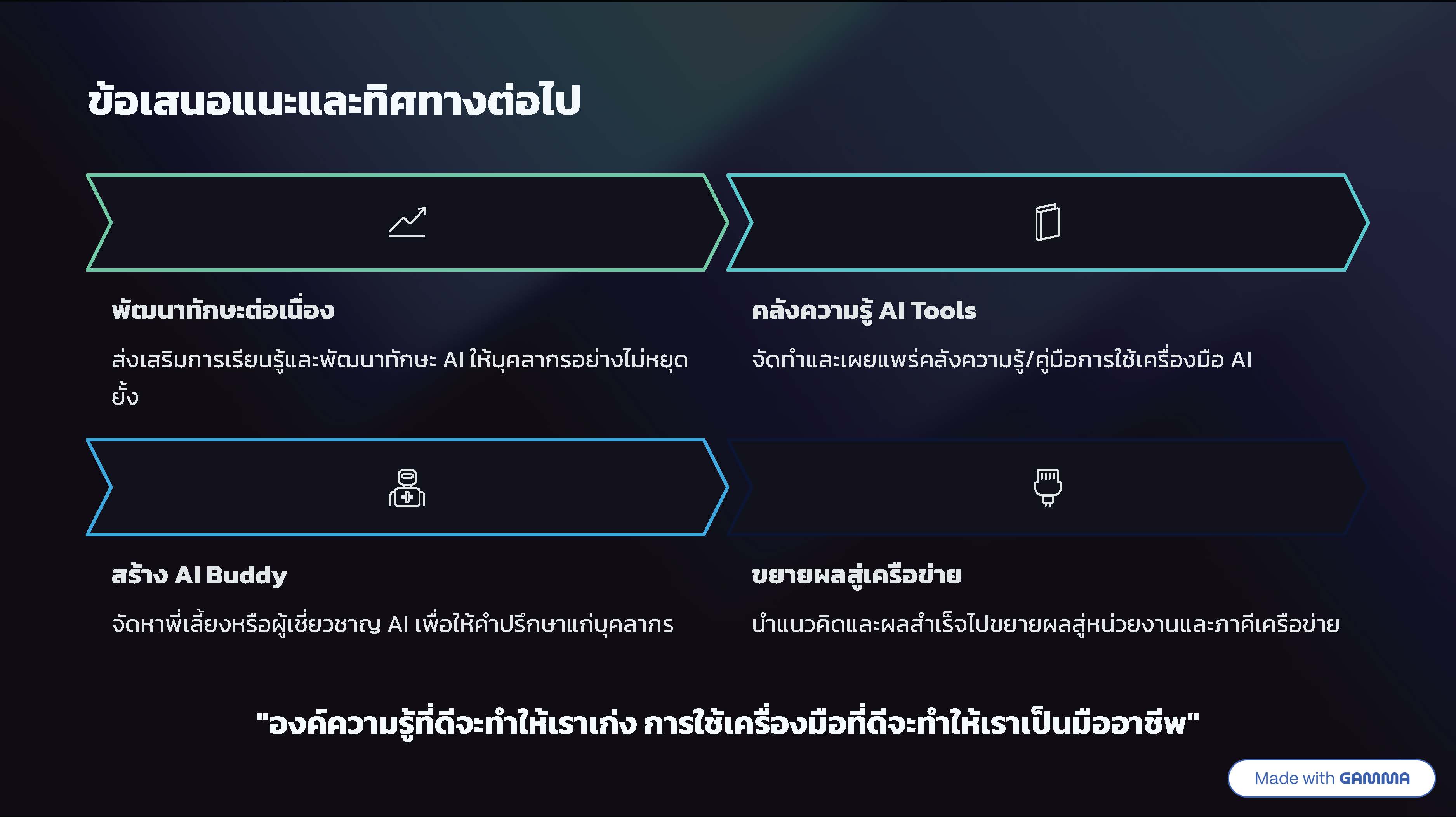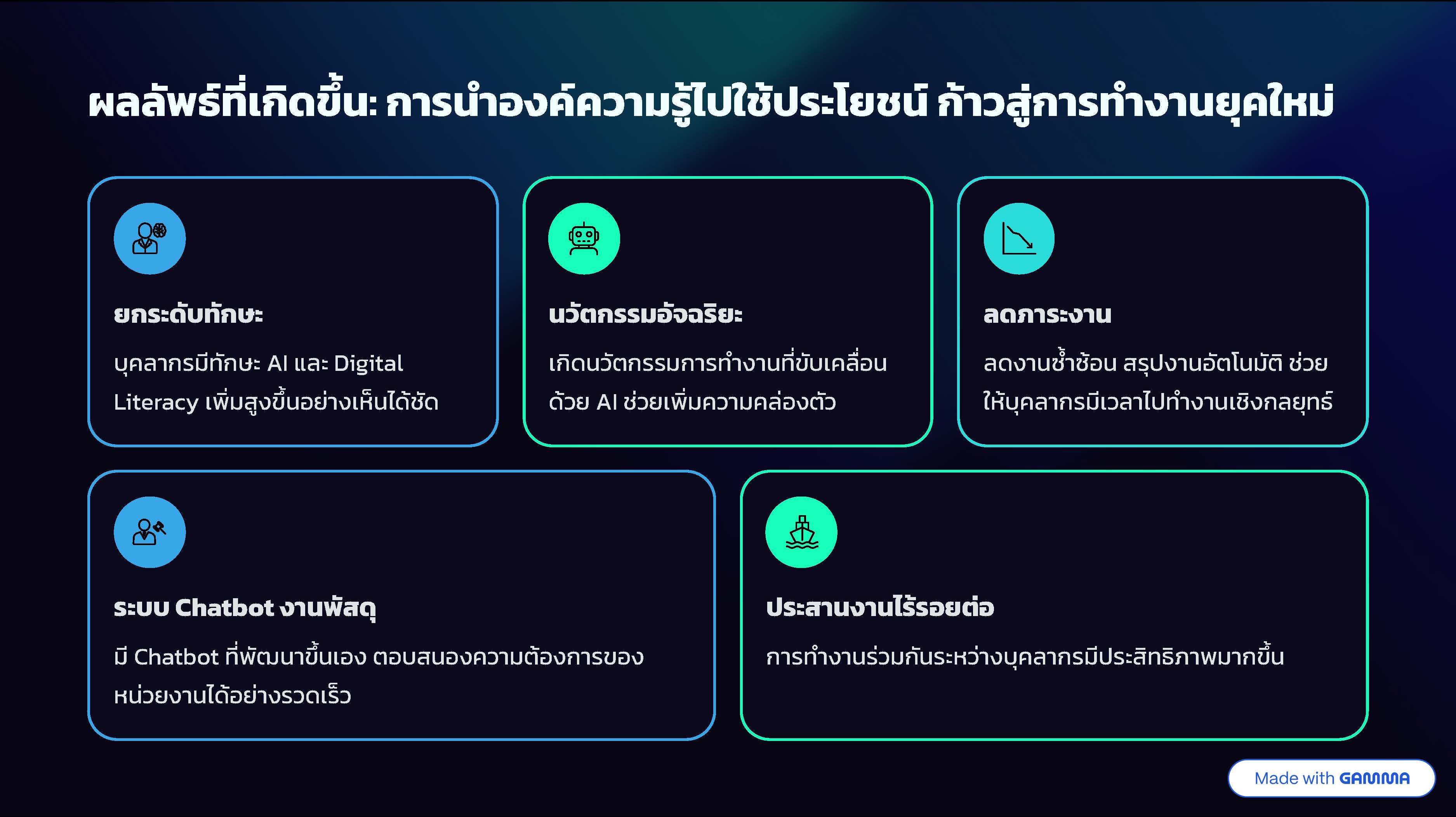 ซึ่งเป็นแนวทางในการสร้างวัฒนธรรมองค์สู่การเป็นมหาวิทยาลัยดิจิทัล อย่างไรก็ตาม ความสำเร็จของการนำ AI มาใช้ในการจัดการความรู้ยังขึ้นอยู่กับคุณภาพของข้อมูลด้วย หากข้อมูลมีความถูกต้อง เป็นปัจจุบัน และมีโครงสร้างที่ดี ระบบ AI ก็จะสามารถทำงานได้อย่างมีประสิทธิภาพและให้ผลลัพธ์ที่น่าเชื่อถือ ดังนั้น การบูรณาการ AI เข้ากับ KM จึงเป็นแนวทางที่สำคัญในการพัฒนาองค์กรให้สามารถแข่งขันได้ในยุคข้อมูลข่าวสาร อีกทั้งยังส่งเสริมการพัฒนาศักยภาพบุคลากรและเพิ่มขีดความสามารถของมหาวิทยาลัยราชภัฏสวนสุนันทาได้อย่างยั่งยืน