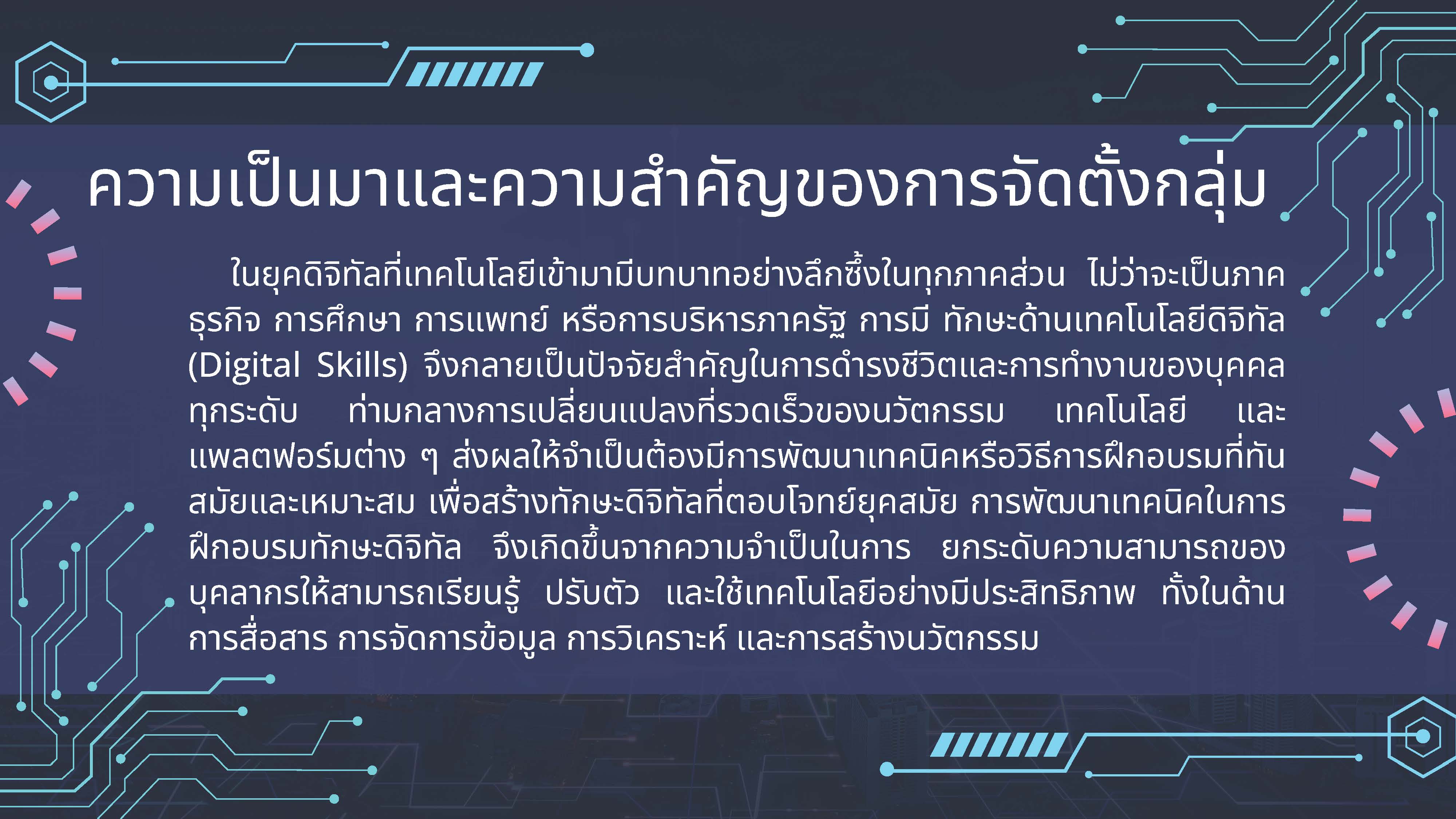 ในยุคดิจิทัลที่เทคโนโลยีเข้ามามีบทบาทอย่างลึกซึ้งในทุกภาคส่วน ไม่ว่าจะเป็นภาคธุรกิจ การศึกษา การแพทย์ หรือการบริหารภาครัฐ การมี ทักษะด้านเทคโนโลยีดิจิทัล (Digital Skills) จึงกลายเป็นปัจจัยสำคัญในการดำรงชีวิตและการทำงานของบุคคลทุกระดับ ท่ามกลางการเปลี่ยนแปลงที่รวดเร็วของนวัตกรรม เทคโนโลยี และแพลตฟอร์มต่าง ๆ ส่งผลให้จำเป็นต้องมีการพัฒนาเทคนิคหรือวิธีการฝึกอบรมที่ทันสมัยและเหมาะสม เพื่อสร้างทักษะดิจิทัลที่ตอบโจทย์ยุคสมัย การพัฒนาเทคนิคในการฝึกอบรมทักษะดิจิทัล จึงเกิดขึ้นจากความจำเป็นในการ ยกระดับความสามารถของบุคลากรให้สามารถเรียนรู้ ปรับตัว และใช้เทคโนโลยีอย่างมีประสิทธิภาพ ทั้งในด้านการสื่อสาร การจัดการข้อมูล การวิเคราะห์ และการสร้างนวัตกรรม