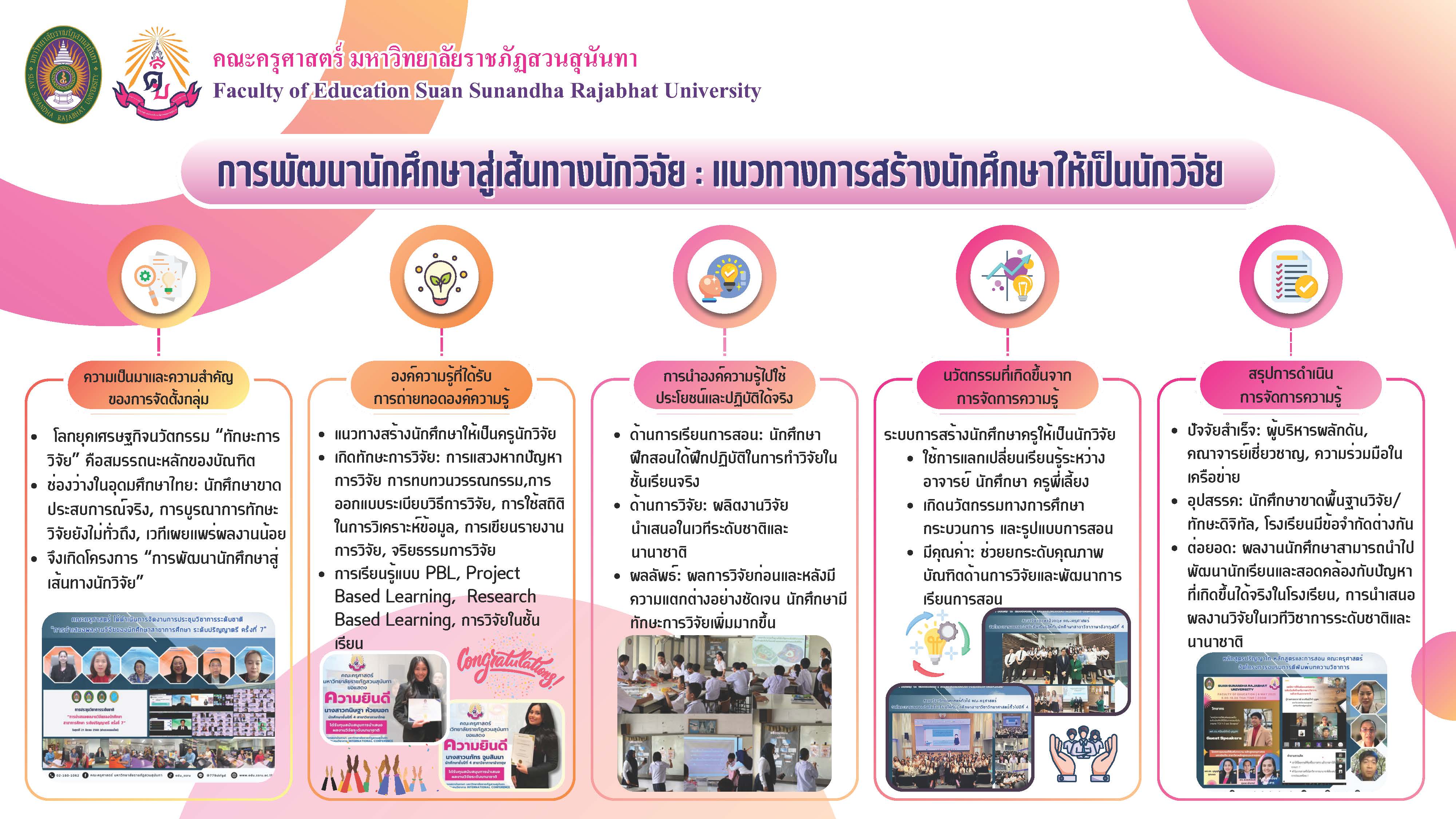 อย่างไรก็ดี ในบริบทอุดมศึกษาไทยยังพบ ช่องว่าง สำคัญ ได้แก่ (1) นักศึกษาจำนวนมากขาดประสบการณ์วิจัยจริงและการกำกับดูแลแบบกัลยาณมิตร (mentoring) ที่ต่อเนื่อง (2) การบูรณาการทักษะวิจัยเข้ากับรายวิชาและการเรียนรู้เชิงปฏิบัติการยังไม่ทั่วถึง (3) โอกาสเผยแพร่ผลงานและเข้าร่วมเครือข่ายวิจัยระดับชาติ/นานาชาติยังมีจำกัด และ (4) วัฒนธรรมการวิจัยในระดับปริญญาตรียังไม่เข้มแข็งเพียงพอ ส่งผลให้บัณฑิตจำนวนไม่น้อยขาดความพร้อมในการต่อยอดสู่การศึกษาระดับสูง งานวิจัยอาชีพ หรือการแก้ปัญหาจริงของชุมชนและสังคมด้วยหลักฐานเชิงประจักษ์
