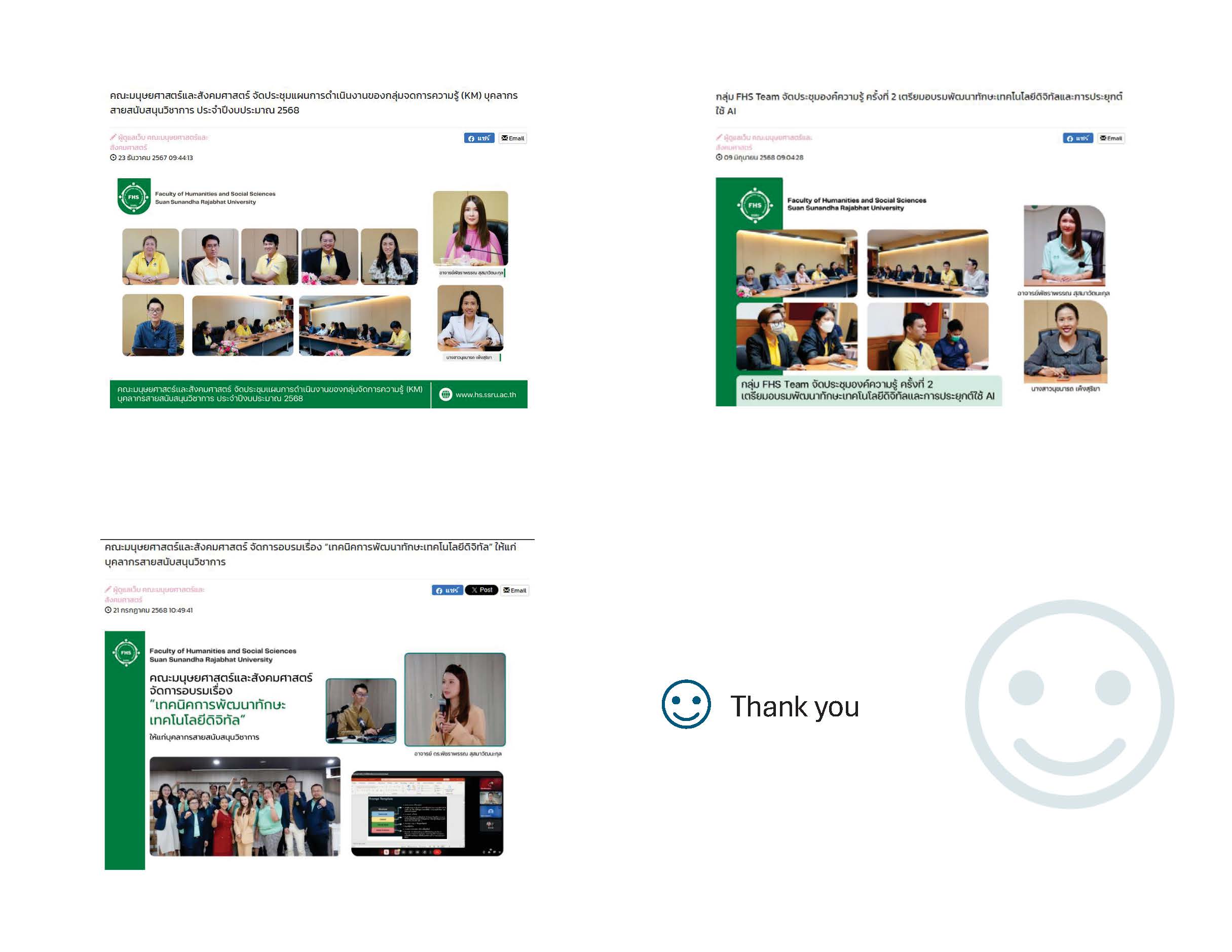 ในยุคปัจจุบันที่เทคโนโลยีดิจิทัลมีบทบาทสำคัญในการดำเนินชีวิตและการทำงาน การเปลี่ยนผ่านสู่สังคมดิจิทัลอย่างรวดเร็วส่งผลให้บุคลากรในภาครัฐ ภาคเอกชน และภาคการศึกษา จำเป็นต้องปรับตัวให้ทันต่อการเปลี่ยนแปลง โดยเฉพาะอย่างยิ่งในภาคการศึกษา ซึ่งมีบทบาทสำคัญในการผลิตและพัฒนาทรัพยากรมนุษย์ให้มีความพร้อมต่อการแข่งขันในโลกยุคใหม่ คณะมนุษยศาสตร์และสังคมศาสตร์ มหาวิทยาลัยราชภัฏสวนสุนันทา เล็งเห็นถึงความสำคัญของการส่งเสริมและพัฒนาทักษะด้านเทคโนโลยีดิจิทัลแก่บุคลากร ทั้งในด้านความรู้พื้นฐาน ทักษะการใช้งานเครื่องมือดิจิทัล และการนำเทคโนโลยีไปประยุกต์ใช้กับการปฏิบัติงานต่างๆ ในสำนักงานคณบดี ได้แก่ งานสารบรรณ, งานประชาสัมพันธ์ ,งานอาคารสถานที่, งานพัสดุ ,งานการเงิน, งานบริการการศึกษา, งานแผนงานและประกันคุณภาพ, งานกิจการนักศึกษา, งานวิจัย, งานแผนธุรกิจและจัดหารายได้ ดังนั้น การจัดกิจกรรมแลกเปลี่ยนเรียนรู้ผ่านกระบวนการจัดการความรู้ (KM) ในหัวข้อ "เทคนิคการพัฒนาทักษะเทคโนโลยีดิจิทัล" จึงมีจุดมุ่งหมายเพื่อให้บุคลากรได้เรียนรู้แนวทาง เทคนิค และวิธีการพัฒนาทักษะที่สามารถนำไปใช้จริง อันจะนำไปสู่การยกระดับสมรรถนะของบุคลากรและเพิ่มประสิทธิภาพในการปฏิบัติงานของคณะในภาพรวม