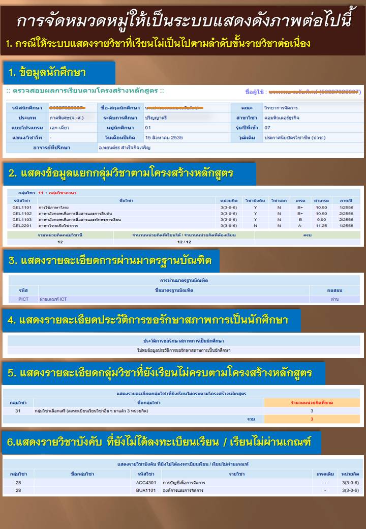 สำหรับการจัดการความรู้ให้เป็นระบบในปีงบประมาณ พ.ศ. 2559 ได้มีการต่อยอดจากปีที่ผ่านมา คือ ได้มีการพัฒนาให้ระบบแสดงรายวิชาที่เรียนไม่เป็นไปตามลำดับขั้นรายวิชาต่อเนื่อง และ แสดงรายละเอียดวิชาที่เรียนไม่ตรงตามโครงสร้างหลักสูตร และนำมาจัดให้เป็นหมวดหมู่เพื่อให้ผู้รับบริการสามารถเข้าถึงข้อมูลได้ง่าย |