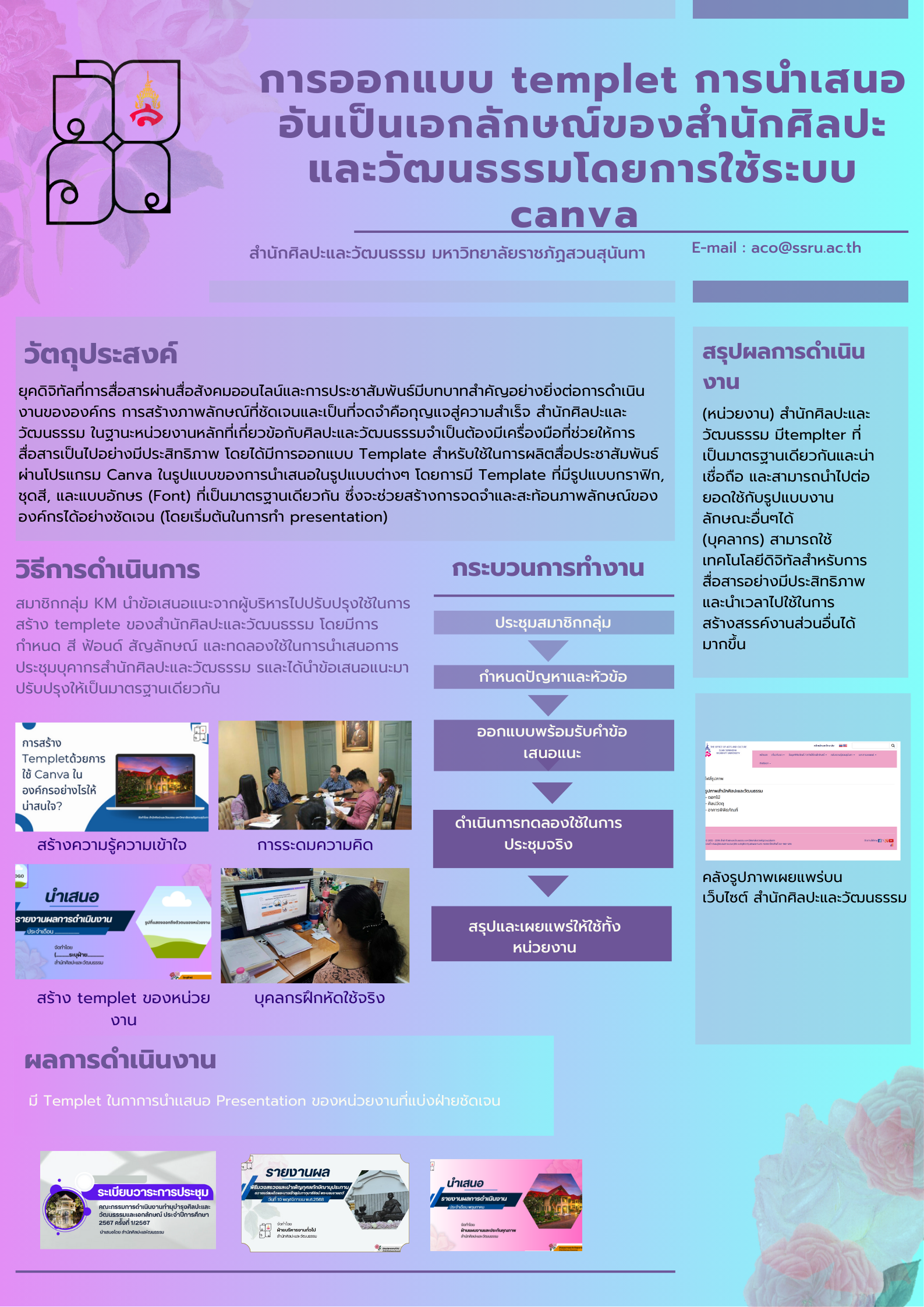 ในยุคดิจิทัลที่การสื่อสารผ่านสื่อสังคมออนไลน์และการประชาสัมพันธ์มีบทบาทสำคัญอย่างยิ่งต่อการดำเนินงานขององค์กร การสร้างภาพลักษณ์ที่ชัดเจนและเป็นที่จดจำคือกุญแจสู่ความสำเร็จ สำนักศิลปะและวัฒนธรรม ในฐานะหน่วยงานหลักที่เกี่ยวข้อกับศิลปะและวัฒนธรรม จำเป็นต้องมีเครื่องมือที่ช่วยให้การสื่อสารเป็นไปอย่างมีประสิทธิภาพ โดยได้มีการออกแบบ Template สำหรับใช้ในการผลิตสื่อประชาสัมพันธ์ผ่านโปรแกรม Canva ในรูปแบบของการนำเสนอในรูปแบบต่างๆ โดยการมี Template ที่มีรูปแบบกราฟิก, ชุดสี, และแบบอักษร (Font) ที่เป็นมาตรฐานเดียวกัน ซึ่งจะช่วยสร้างการจดจำและสะท้อนภาพลักษณ์ขององค์กรได้อย่างชัดเจน ทำให้สาธารณชนรับรู้ได้ทันทีว่าเนื้อหานี้มาจากสำนักศิลปะและวัฒนธรรม ซึ่งเป็นการสร้างความน่าเชื่อถือและตอกย้ำบทบาทหน้าที่ของสำนักศิลปะและวัฒนธรรม.