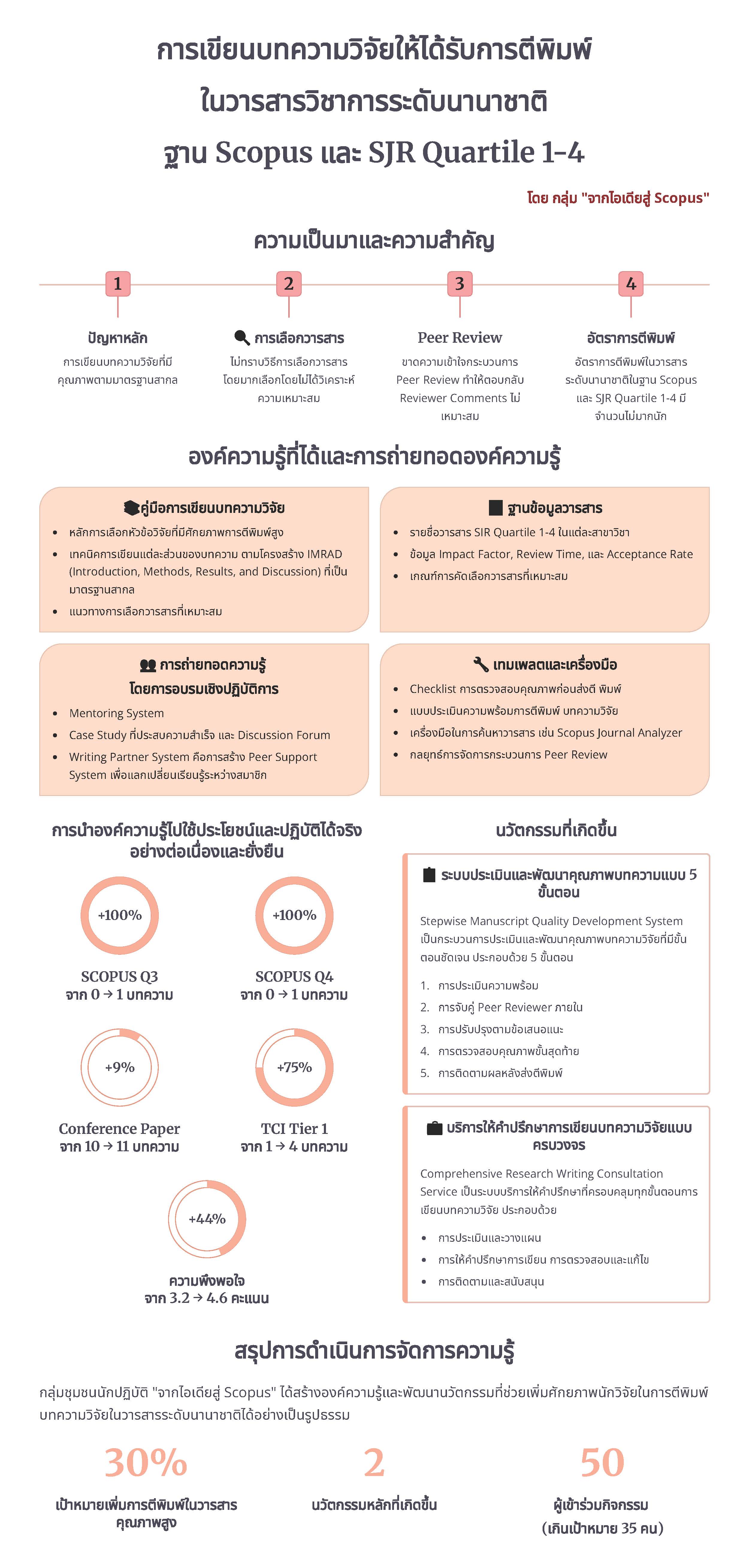 การตีพิมพ์บทความวิจัยในวารสารวิชาการระดับนานาชาติที่อยู่ในฐานขMอมูล Scopus และมีค่า SJR Quartile 1-4 เป็นเป้าหมายสำคัญของนักวิจัยในยุคปัจจุบัน อย่างไรก็ตาม การเขียนบทความวิจัยให้ได้มาตรฐานสากลและผ่านกระบวนการ Peer Review ที่เข้มงวดนั้นต้องอาศัยความรู้และทักษะเฉพาะ
