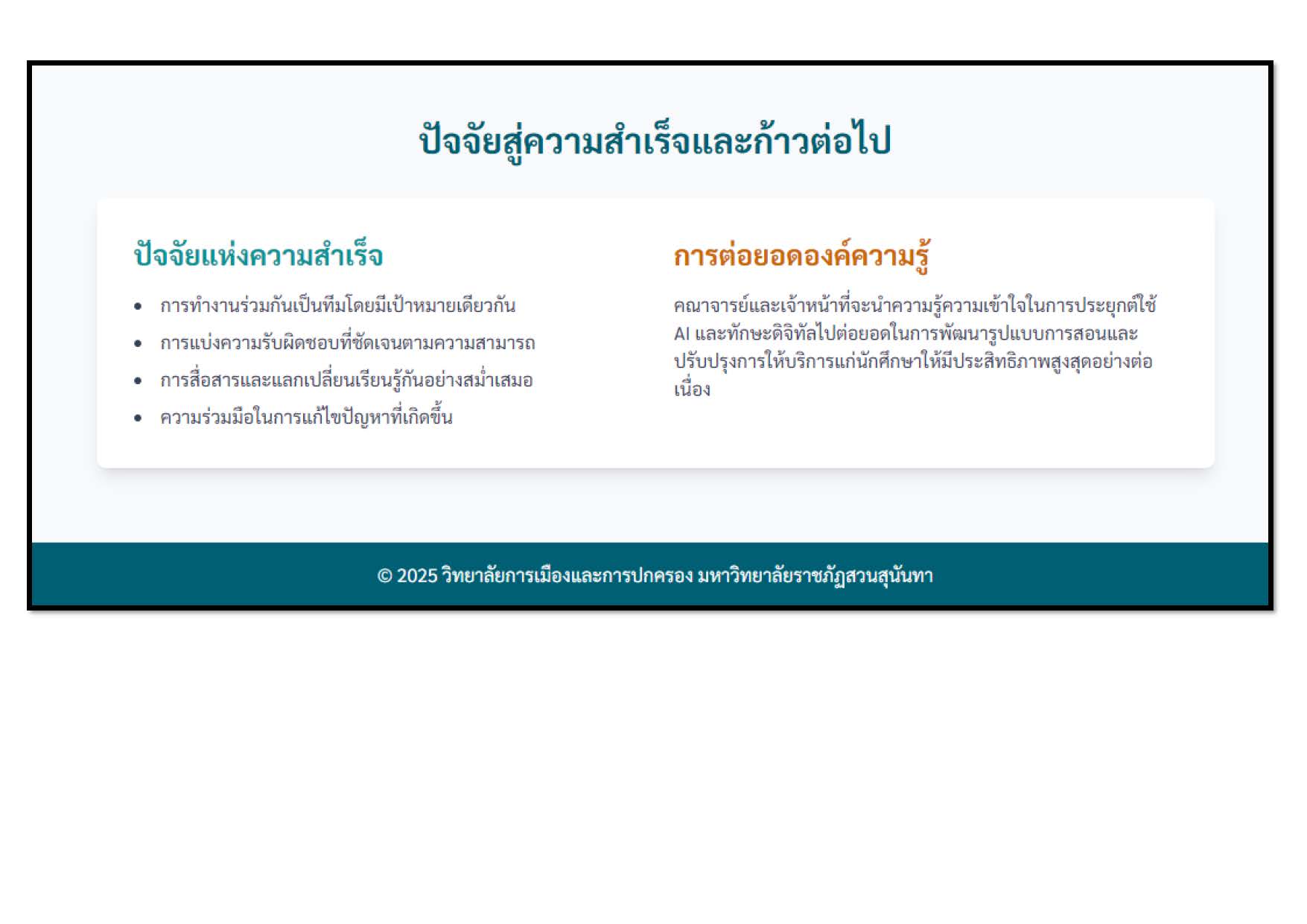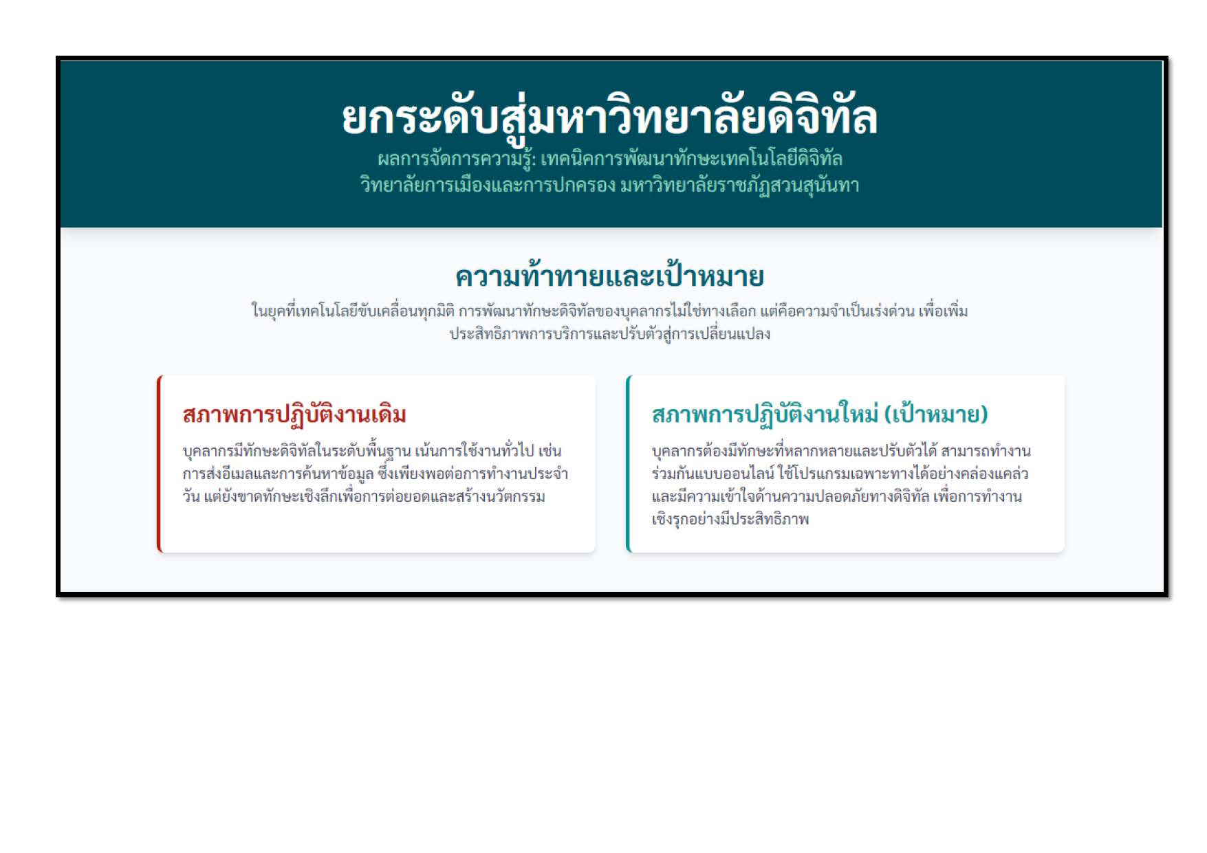 ทักษะเทคโนโลยีดิจิทัล (Digital Skills) มีความสำคัญอย่างมากในยุคปัจจุบัน เนื่องจากเทคโนโลยีได้เข้ามามีบทบาทสำคัญในทุกด้านของชีวิต ทั้งการทำงาน การเรียนรู้ การใช้ชีวิตประจำวัน และการติดต่อสื่อสาร การพัฒนาทักษะเหล่านี้จึงมีความจำเป็นอย่างยิ่ง เพื่อให้สามารถปรับตัวและใช้ประโยชน์จากเทคโนโลยีดิจิทัลได้อย่างมีประสิทธิภาพและประสิทธิผลในการบริการแก่บุคลาการสายวิชาและนักศึกษาของวิทยาลัยการเมืองและการปกครอง มหาวิทยาลัยราชภัฏสวนสุนันทา
