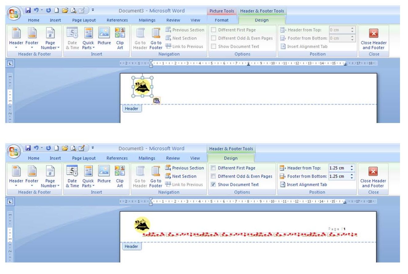 ![]() เพื่อเลือกแบบอัตโนมัติ หรือหากต้องการจัดทำเองให้คลิกที่ Edit Header เช่นเดียวกับ Footer เพื่อทำการตกแต่งเอง เช่นต้องการเพิ่มรูปภาพเพื่อความสวยงาม ให้คลิกที่แถบเครื่องมือ กด Insert เพื่อBrowser หารูปภาพเพื่อแทรกไว้ที่ Header หากรูปภาพมีขนาดใหญ่มากก็ทำการลดขนาดของรูปภาพลง โดยคลิกที่รูปภาพ แล้วกด Size