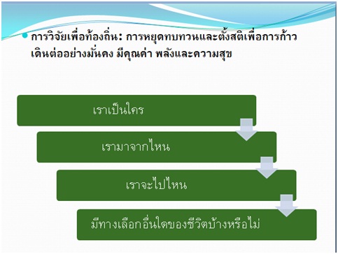 ผู้ให้ความรู้ ผู้ช่วยศาสตราจารย์ ดร.บัญชร แก้วส่อง คุณลักษณะสำคัญของการวิจัยเพื่อท้องถิ่น - ปัญหาการวิจัยมาจากท้องถิ่น - มีปฏิบัติการเพื่อให้ได้คำตอบของปัญหา (การสร้างความรู้และการเลือกใช้ความรู้โดยประชาชน) - คนในท้องถิ่นเป็นนักวิจัยหรือมีส่วนร่วมในการวิจัย เป้าหมายสำคัญของการวิจัยเพื่อท้องถิ่น - การสร้างความรู้: สถานการณ์ รากเหง้า เป้าหมาย และวิธีการสู่เป้าหมาย - การสร้างคน: ผู้ตื่น ผู้รู้ ผู้เบิกบาน - การสร้างการเปลี่ยนแปลง: กลุ่ม/องค์กร ระบบนิเวศน์ เศรษฐกิจ สังคม การเมือง สู่ ความเข้มแข็งของชุมชนท้องถิ่น ทุกข์: การศึกษาความทุกข์ให้ชัด สมุทัย: การวิเคราะห์เหตุแห่งทุกข์เพื่อวางแผนปฏิบัติการให้พ้นทุกข์ นิโรธ: การกำหนดเป้าหมายสู่การดับทุกข์ มรรค: การลงมือปฏิบัติการเพื่อการดับทุกข์