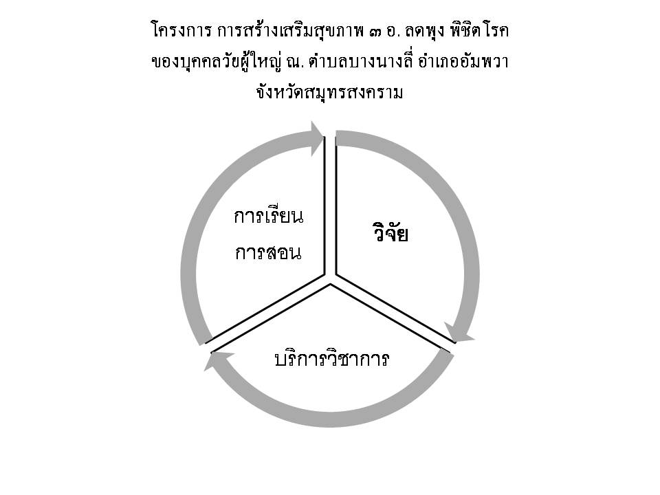 ประเด็นสำคัญของการแลกเปลี่ยนเรียนรู้ คือ 1.รับฟังอย่างตั้งใจ เปิดโอกาสให้สมาชิกในกลุ่มทุกคนได้แสดงความคิดเห็น และ รับฟังทุกความคิดเห็นที่สมาชิกได้แสดงออกมา 2.สรุปประเด็นร่วม นำสิ่งที่รับฟังทั้งหมดมาร่วมกันสรุป เป็นประเด็นร่วมกันของกลุ่มที่ยอมรับได้ ซึ่งสมาชิกทุกคนต้องเปิดใจกว้าง พร้อมที่จะ ปรับเปลี่ยน ถึงแม้ว่าบางกรณีอาจจะไม่ตรงกับความคิดเห็นของตนเอง 3.มีผู้รับผิดชอบ ผู้รับผิดชอบแต่ล่ะคน ร่วมกันทำงานตามบทบาทหน้าที่ของตนเอง 4.การสื่อสาร ระบบการสื่อสารที่ชัดเจนเป็นลายลักษณ์อักษร ข้อมูลทั่วถึง 5.การถอดบทเรียน ถอดบทเรียนและบันทึกเพื่อใช้ประโยชน์ในการพัฒนางานKM ต่อไป 6.การประชุม จัดประชุมเพื่อแลกเปลี่ยนเรียนรู้ร่วมกันเป็นระยะๆ ตลอดการดำเนินงาน ผลจาก การจัดการความรู้ของกลุ่มดอกปีป (Peep Flower KM ) ผลจาก การจัดการความรู้ของกลุ่มดอกปีป (Peep Flower KM ) ช่วยให้ได้ โครงการวิจัยที่ผสมผสานระหว่าง การวิจัย การเรียนการสอน และการบริการวิชาการ 1 เรื่อง โดยมีชื่อ โครงการวิจัย ว่า โครงการ การสร้างเสริมสุขภาพ ๓ อ. ลดพุงพิชิตโรค ของบุคคลวัยผู้ใหญ่ ณ. ตำบลบางนางลี่ อำเภออัมพวา จังหวัดสมุทรสงคราม ตาม รูปภาพที่1